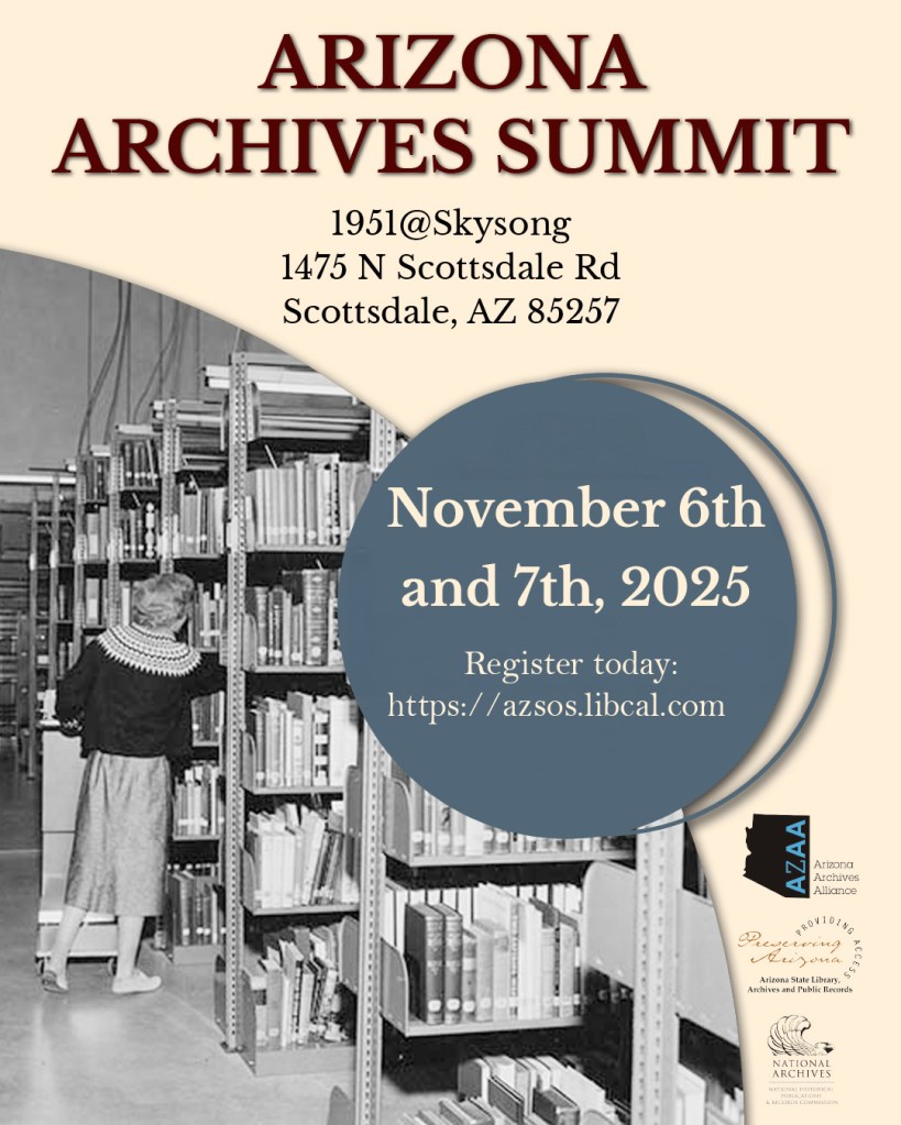 Registration for the Arizona Archives Summit is still open! The event is free and open to anyone interested in archives in Arizona; students, volunteers, professionals, retirees, archives-curious–everyone is welcome to attend. Please use the links below to register for the in-person and virtual (Zoom) options each day: